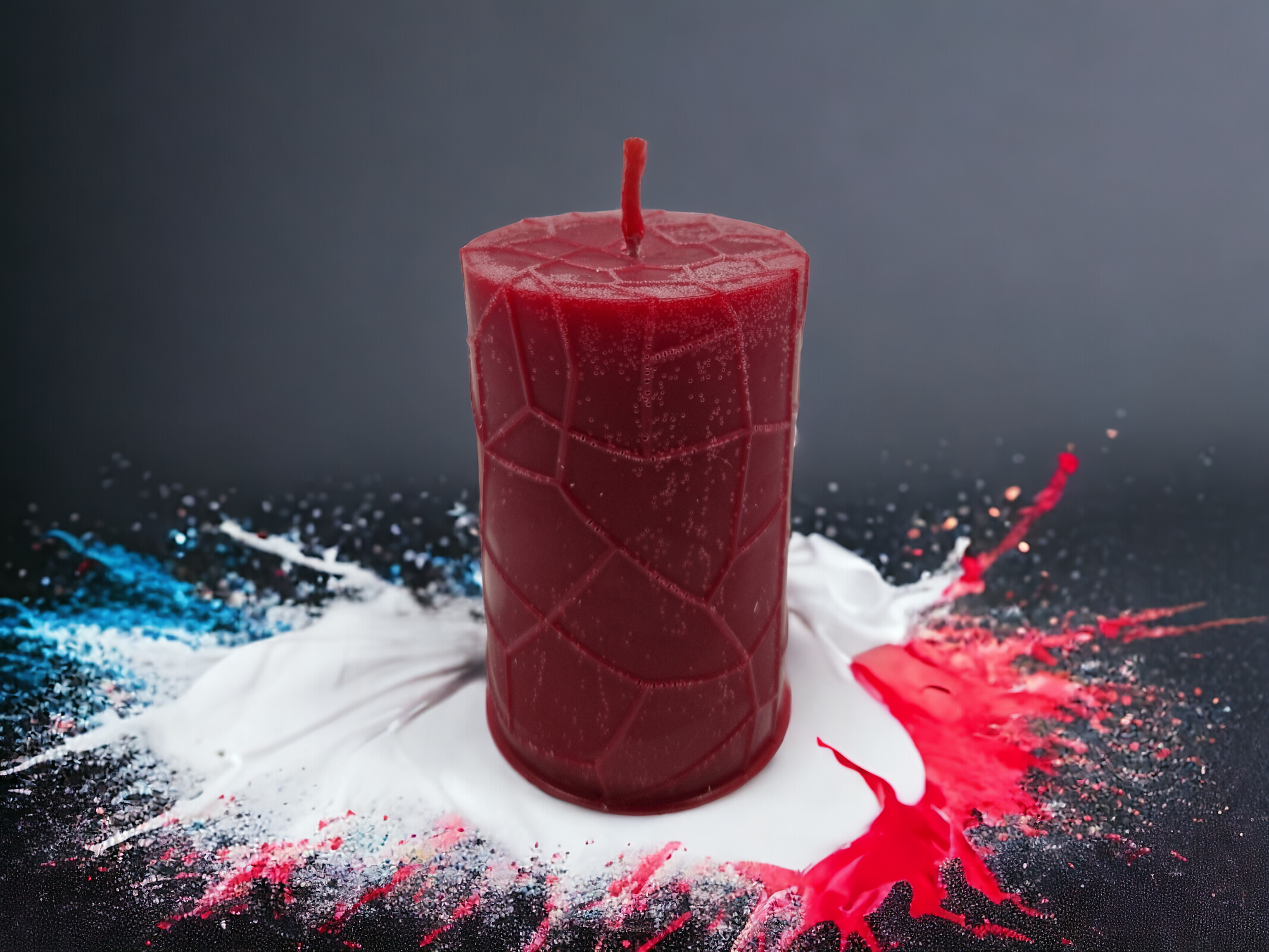 Deze kleine cilindervormige kaars is voorzien van een uniek slangenhuid patroon.